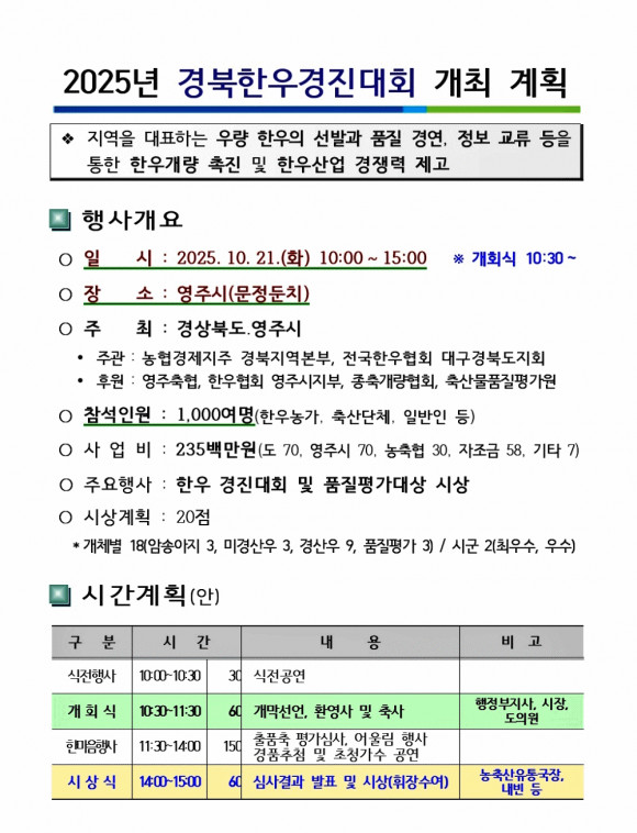 경상북도는 21일 영주시 문정 둔치에서 경상북도 최고의 우량한우를 선발하는‘2025년 경북한우경진대회’를 개최했다.