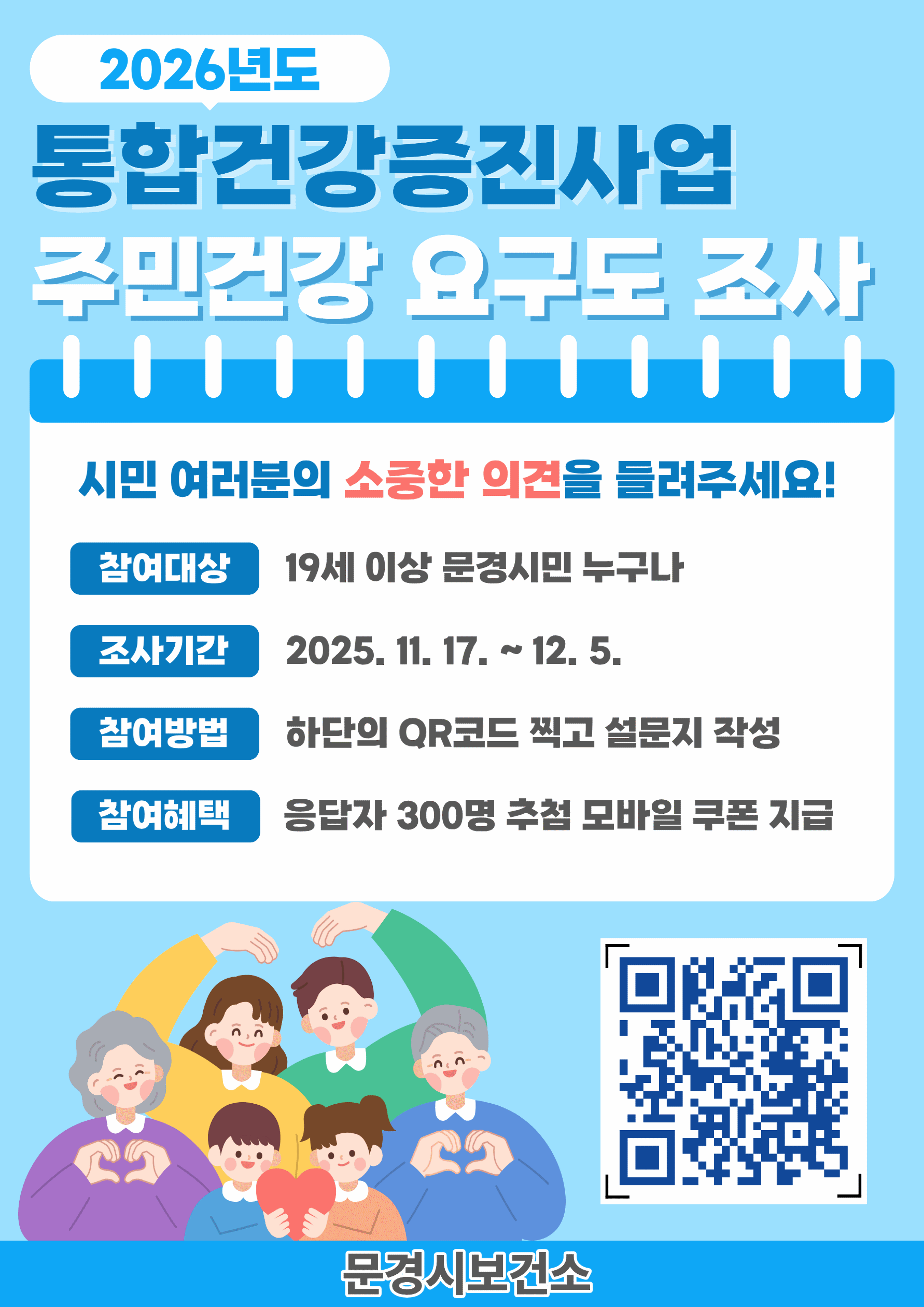이번 조사는 2026년도 통합건강증진사업의 우선순위와 핵심 성과지표 선정 등 주민들의 건강 수요와 지역사회 특성을 반영한 보건정책 추진을 위해 마련됐으며, 설문 내용은 △통합건강증진사업 인식도 △서비스 만족도 △사업대상 우선순위 △건강증진사업 선호도 등 총 12개 문항으로 구성하였다.