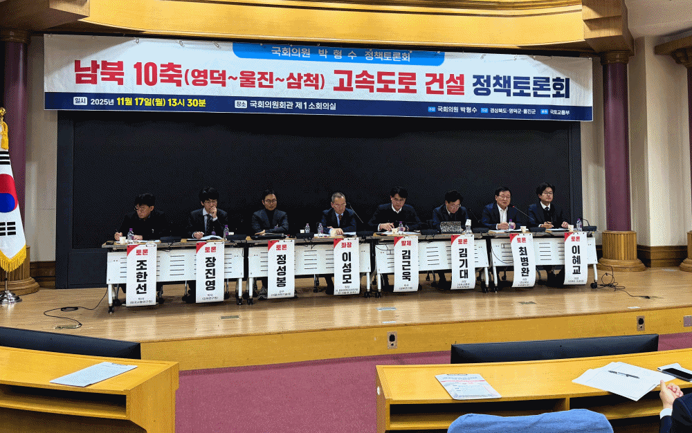 토론회를 주최한 박형수 의원은 “지난 11월 8일 포항~영덕 구간이 개통됨에 따라 국가 간선망 완결의 최종 단계로 진입했으나, 대한민국 에너지 산업 벨트이면서 동해안 관광산업의 핵심지역인 ‘영덕~삼척’구간이 함께 완성되지 못한 점은 매우 아쉽다”며 “오늘 토론회를 통해 남북10축 고속도로 신설에 대한 공감대가 형성된 만큼, 참석해 주신 분들과 함께 사업이 추진될 수 있도록 노력하겠다”고 말했다.