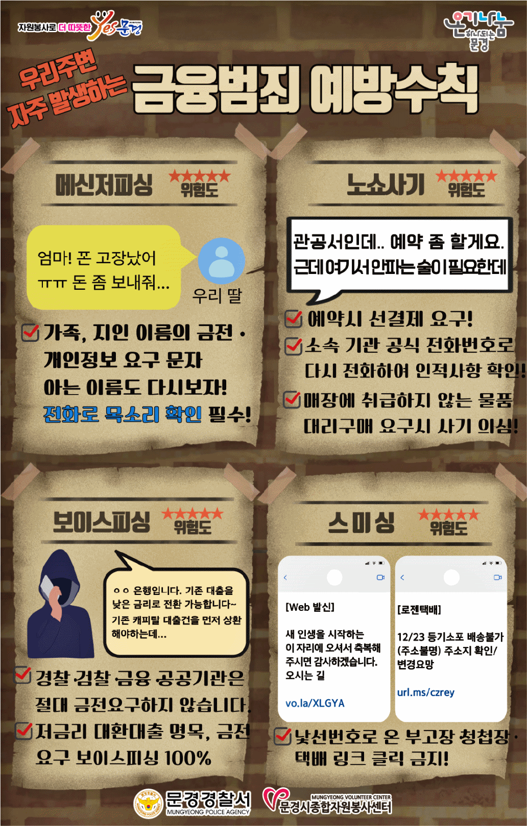 문경시종합자원봉사센터는 연말연시를 맞아 보이스피싱과 노쇼 사기 등 다중 피해사기 예방의 일환으로‘사랑의 온기나눔 홍보활동’을 전개하고 있다.