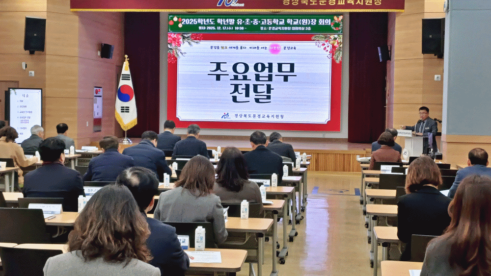 문경교육지원청(교육장 유진선)은 2025년 12월 17일(수) 문경교육지원청 3층 대회의실에서 관내 공·사립 유·초·중·고등학교 학교(원)장 및 교(원)감을 대상으로 2025학년도 학년말 학교 관리자 회의를 개최하였다.