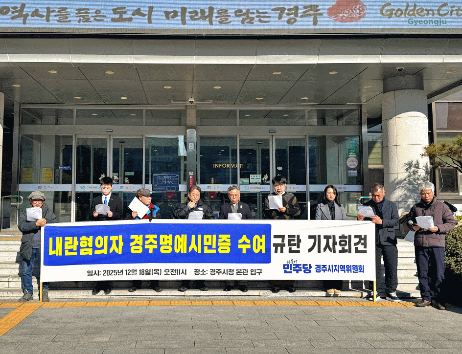 더불어민주당 경주시지역위원회는 18일 오전 11시, 경주시청에서 기자회견을 열고, 12·3 불법 계엄 및 내란 관련 혐의를 받는 인물들이 포함된 명예시민증 수여안을 통과시킨 경주시와 경주시의회를 강력히 규탄했다.