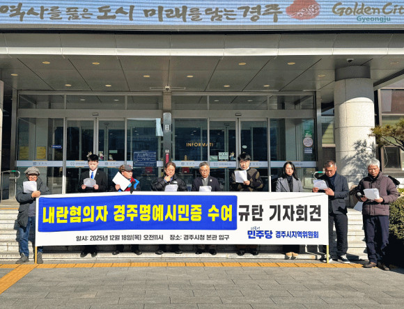 더불어민주당 경주시지역위원회는 “오늘 시의회 통과는 끝이 아니라 더 큰 문제의 시작”이라며 “경주시가 내란의 무게와 시민의 분노를 직시하고, 명예시민증 선정 기준과 절차 전반을 전면 재검토할 때까지 시민과 함께 끝까지 행동하겠다”고 밝혔다.