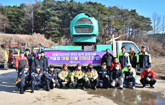 농번기 농기계가 겨울철 마을 지킴이로 산양면 송죽2리에 배치된 초대형 농약살포기(3,000ℓ)는 최대 100m까지 물을 분사할 수 있으며, 20분간 연속 방수가 가능하다. 농번기에는 농약을 살포하고, 겨울철에는 산불진화 장비로 활용하는 일석이조 효과를 기대하고 있다.