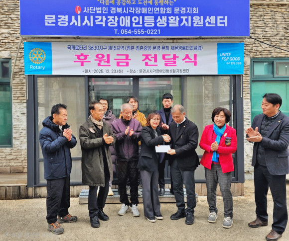 국제로타리 3630지구 제15지역(지역대표 김지훈)은 12월 23일 문경시시각장애인등생활지원센터를 방문해 후원금 170만원을 전달하며 지역사회 나눔 실천에 앞장섰다.