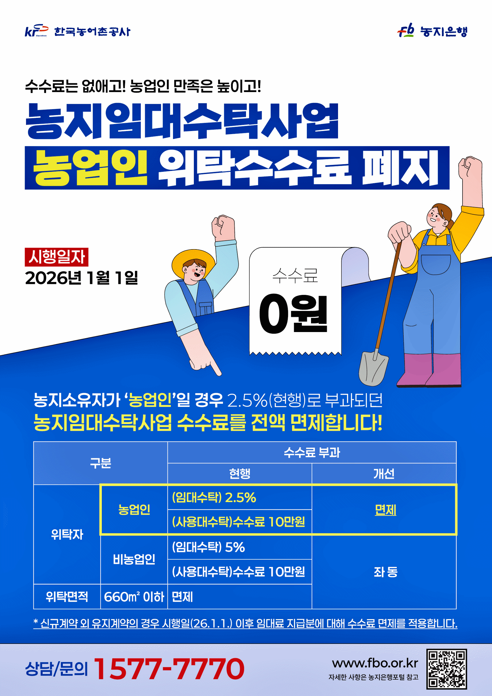 한국농어촌공사(사장 김인중, 이하 ‘공사’)는 2026년 1월 1일부터 농업인을 대상으로 ‘농지임대수탁사업’의 위탁수수료를 전면 폐지한다고 밝혔다.