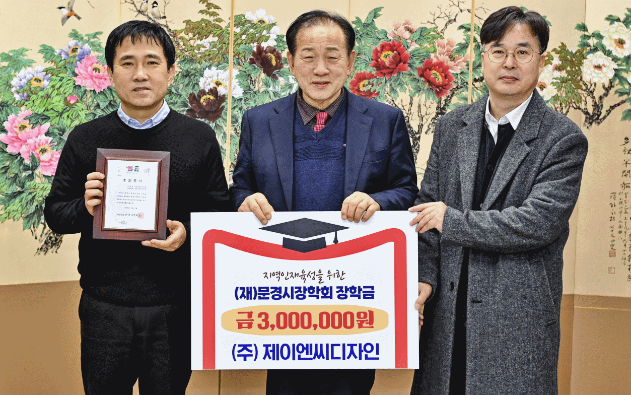 @IMG1(재)문경시장학회는 2일 ㈜제이엔씨디자인이 지역인재 육성을 위해 300만 원의 장학금을 문경시장학회에 기탁했다고 밝혔다.