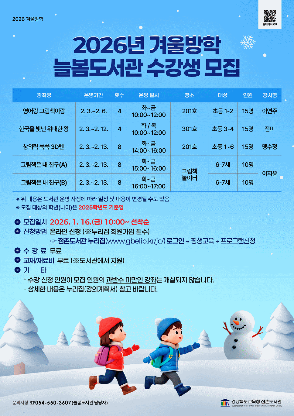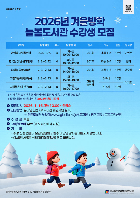 경상북도교육청 점촌도서관(관장 정희경)은 겨울방학 기간 학교 돌봄 공백을 해소하고 어린이들의 건강한 여가활동을 지원하기 위해 2월 3일(화)부터 2월 13일(금)까지 관내 유아 및 초등학생을 대상으로 겨울방학 늘봄도서관을 운영한다.