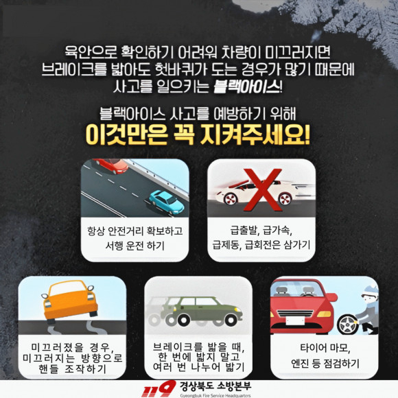 경상북도 소방본부는 겨울철 운전 시, 도로 위 블랙아이스에 대한 각별한 주의를 당부했다.