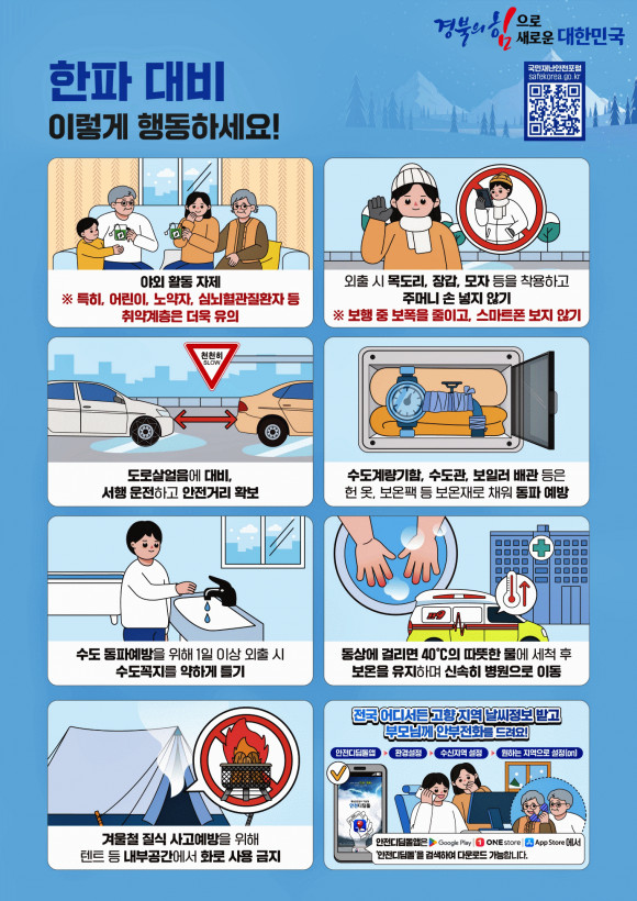 김종수 경상북도 안전행정실장은 “이번 한파에 대한 도민 피해와 불편이 최소화하도록 취약계층 관리, 시설물 안전조치 등 안전대책을 추진”해 줄 것을 강조하면서“도민 여러분께서도 한파로 인한 피해 예방을 위해 국민 행동 요령을 반드시 지켜 주실 것”을 당부했다.