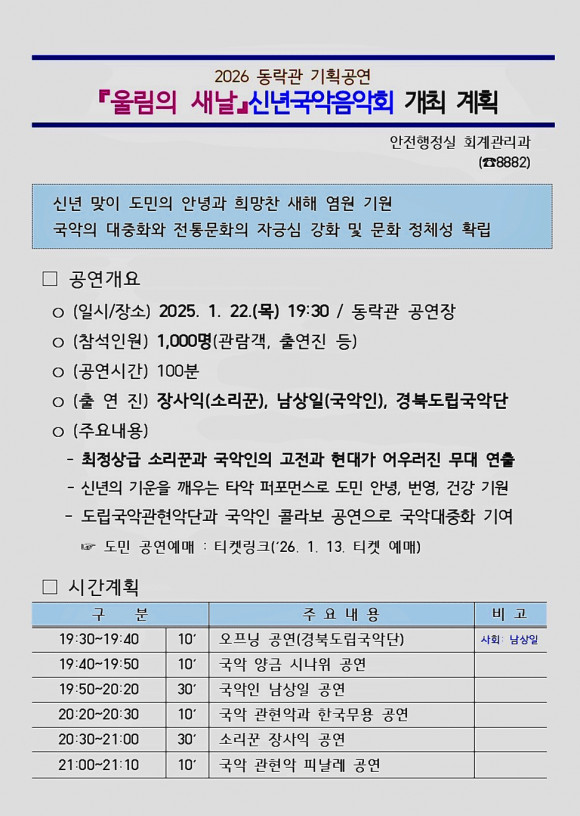 김종수 경상북도 안전행정실장은 "이번 신년 국악음악회가 도민의 새해 시작에 큰 활력과 흥겨운 시간이 되었기를 바란다"며, "앞으로도 다채롭고 내실 있는 공연을 준비해 도민의 일상에 쉼과 즐거움을 선사하겠다"고 밝혔다.