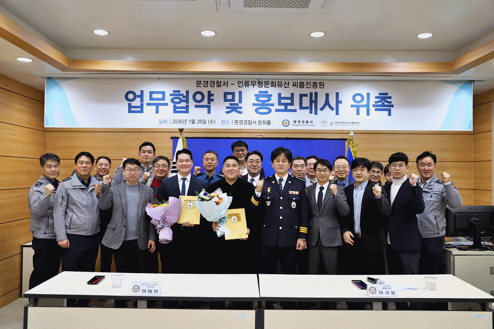 경북 문경경찰서(서장 이규봉)는 28일 인류무형문화유산 씨름진흥원과 범죄예방 홍보 강화를 위한 업무협약(MOU)을 체결하고, 범죄예방 홍보대사를 위촉하며 시민 공감형 치안 홍보에 나섰다.