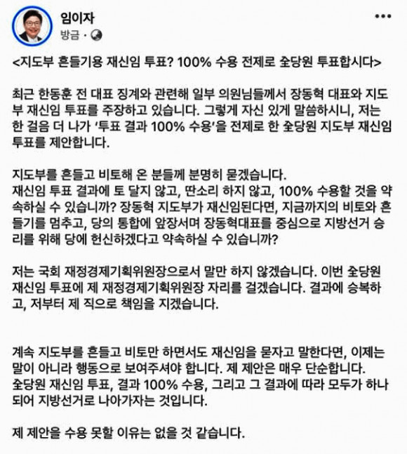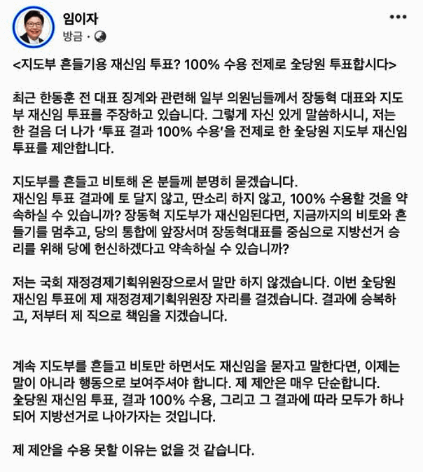 임 위원장은 “지도부를 흔들고 비토해 온 분들께 분명히 묻고 싶다”며 “재신임 투표 결과에 토 달지 않고, 딴소리 하지 않고, 100% 수용할 것을 약속할 수 있냐”고 말했다.