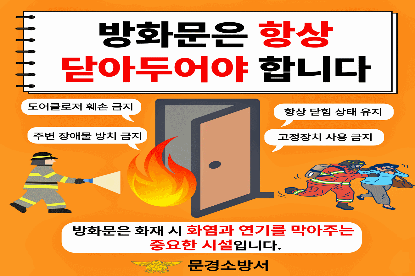 문경소방서 관계자는 “잠깐의 편리함으로 방화문을 열어두는 행위는 모두의 안전을 위협하는 결과를 초래할 수 있다”며, “우리 가족과 이웃의 안전을 위해 방화문을 항상 닫아두고 훼손되지 않도록 관리하며 「소방시설 설치 및 관리에 관한 법률」에 따른 안전 수칙을 철저히 준수해달라”고 당부했다.
