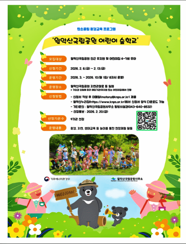 월악산국립공원사무소 이정훈 탐방시설과장은 “「월악산국립공원 어린이 숲학교」는 아이들이 숲 속에서 뛰어놀고 관찰하는 과정 자체가 배움이 되도록 설계한 체험형 환경교육”이라며, “참가비 부담 없이 참여 할 수 있는 만큼 지역 유치원과 어린이들이 월악산국립공원의 자연과 문화를 친근하게 접하고, 탄소중립과 환경보호를 생활 속 실천으로 이어갈 수 있도록 안전하고 알차게 운영하겠다”고 말했다.