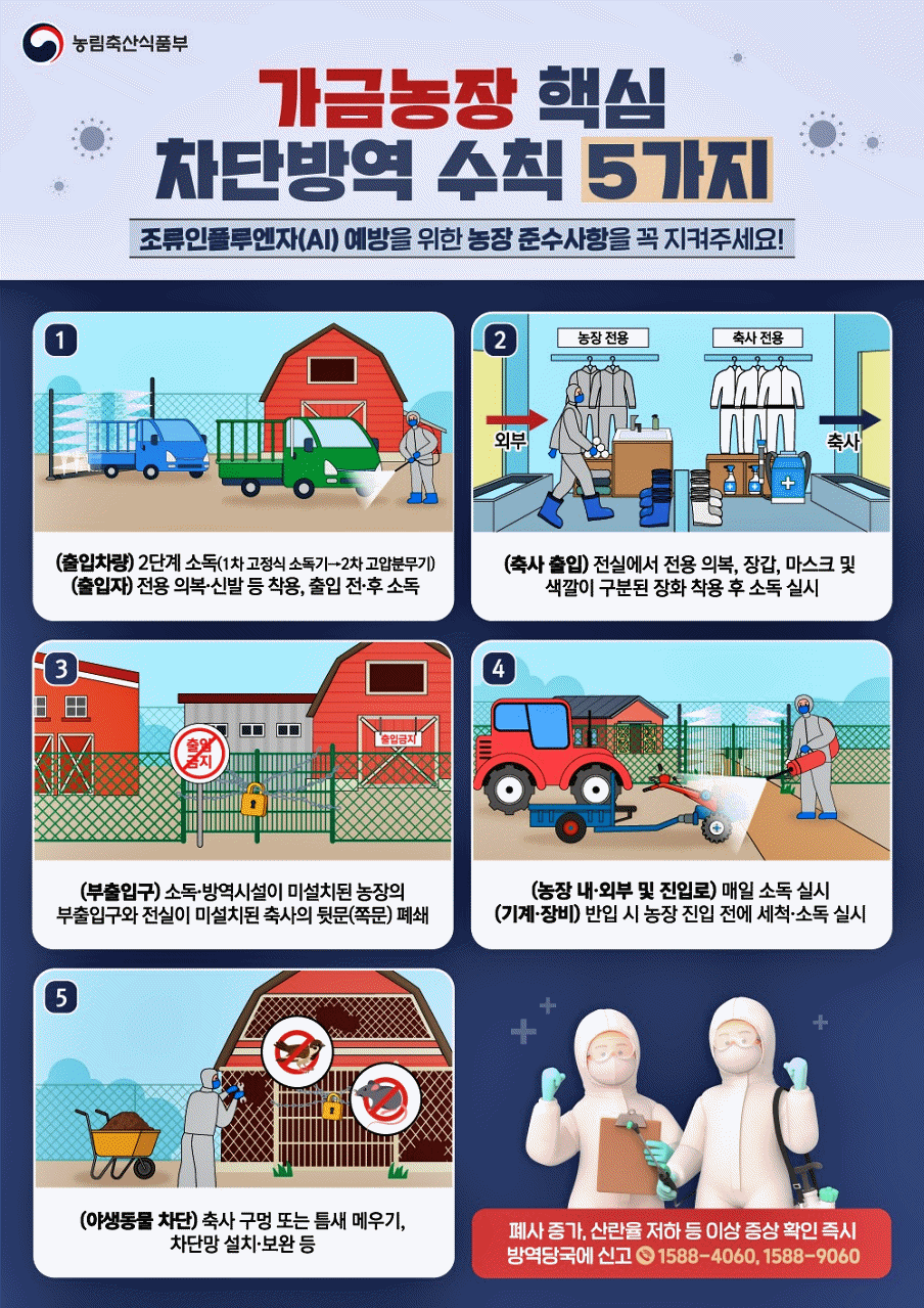 박찬국 경북도 농축산유통국장은 “발생농장에 대한 긴급 방역 조치와 산란계 농장 예찰 강화로 바이러스 확산 방지에 최선을 다하겠다”며, “가금농장에서는 이미 바이러스가 농장에 유입됐을 가능성을 염두해 두고 소독과 차단 방역 수칙을 철저히 준수해 달라. 사료 섭취 저하, 침울. 호읍기 증상, 녹변(녹색 설사) 등 경미한 임상 증상이라도 발견 즉시 시․군 또는 동물위생시험소에 신고해 달라”고 당부했다.