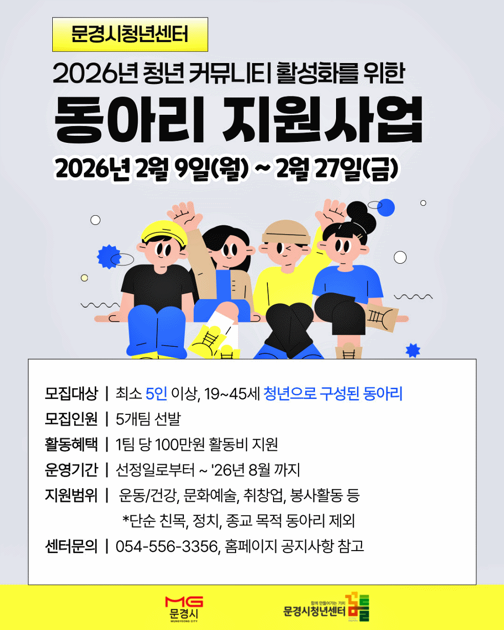 문경시청년센터(센터장 황지은)는 지역 청년의 자발적 네트워크 형성과 활동 기반 강화를 위해‘2026년 문경시 청년 동아리 활동 지원사업’참여 동아리를 모집한다.