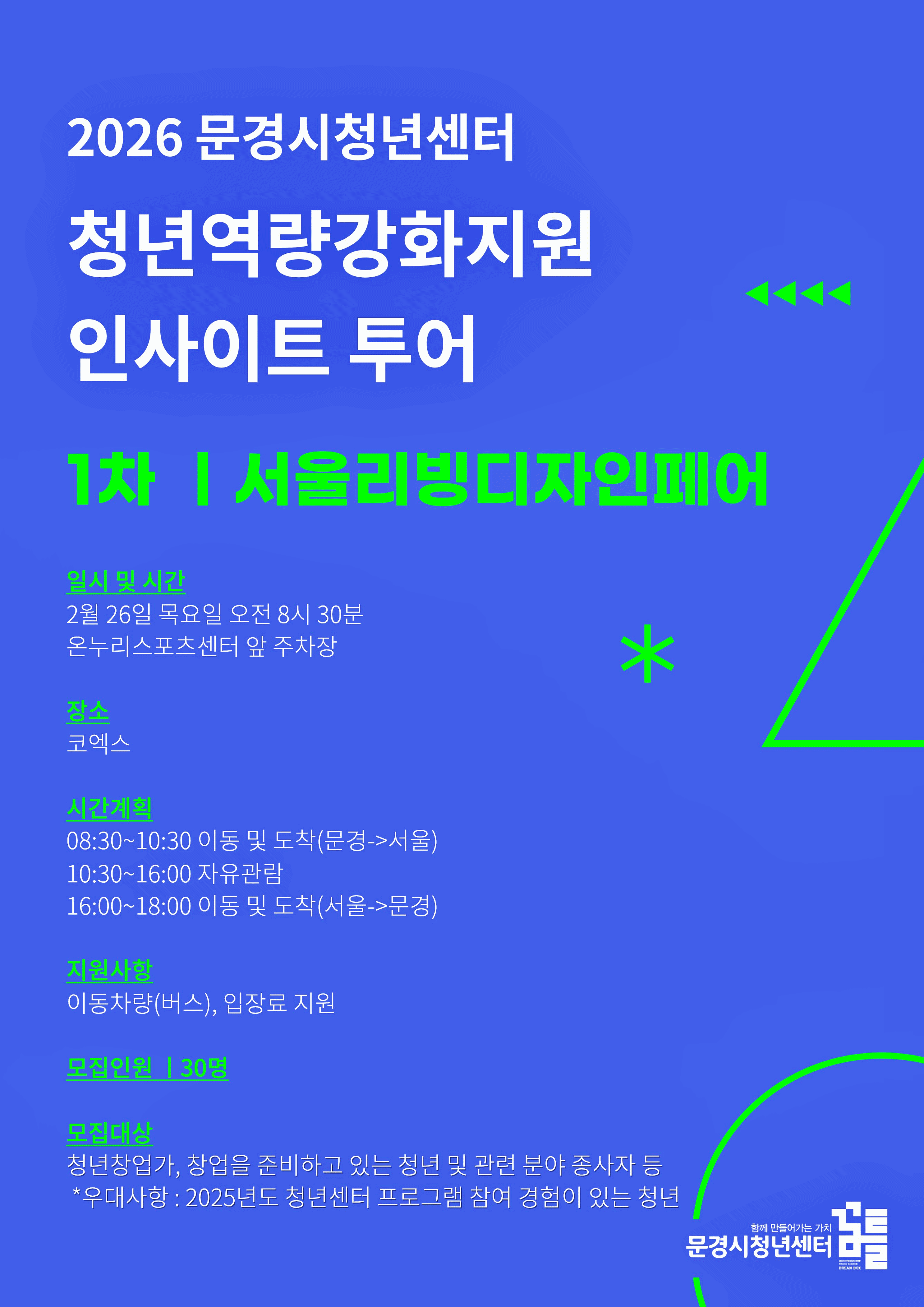 이번 2026 서울리빙디자인페어 참관 프로그램은 현재 참가자를 모집 중이며, 자세한 내용은 문경시청년센터 홈페이지 및 인스타그램 등을 통해 확인할 수 있다.