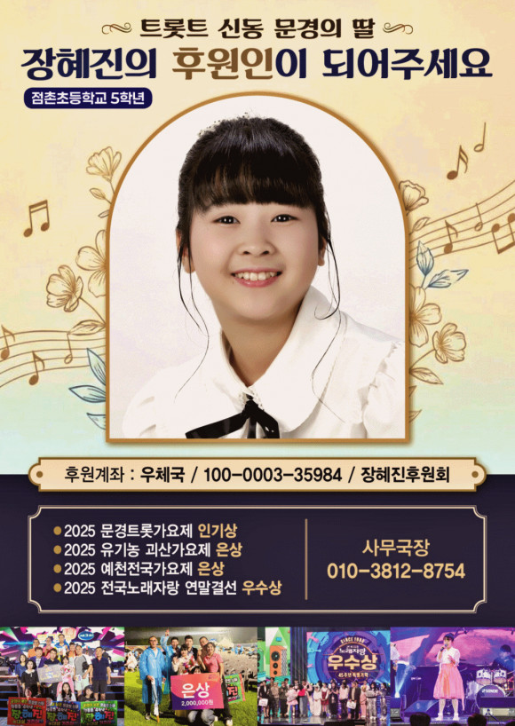 이상일 후원회 운영위원장은 “지역에서 대형 가수가 탄생하는 것은 개인의 영광일 뿐 아니라 문경의 발전에도 큰 도움이 된다”라며 “십시일반 마음을 모아 장혜진 양의 앞길을 밝혀주자”라고 후원에 동참을 권유했다.