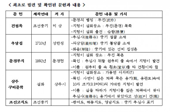 이번 새로 확인된 견훤 관련 문헌은 <견첩록>과 <추담집>과 <문경부지>다. 그 외에 상주 구비문학 설화에 나오는 견훤설화는 종래에 알려진 지렁이 설화와는 또다른 <옹관묘> 설화의 양상을 띤다. <견첩록>에서는 문경의 별칭이 무진이라는 사실을 통해 견훤이 문경에서 태어났다는 기록이므로 이제는 그가 광주에서 태어났을 것이라는 추정을 불가능하게 만든다. 또 견첩록에서는 <무진 북쪽>이지 <광주 북촌>으로 기록하지 않았고, 이 설화의 출전이 삼국유사의 인용이 아닌 <승람>이라고 쓴 것이 특별하다.