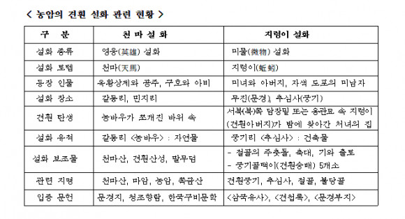 그런데 금하굴과 광주 북촌은 지렁이 설화, 농바우는 천마설화가 유래되고 있고, 그 유적으로는 자연 토템(totem)인 금하굴과 농바우 등이 자리하고 있다. 문제는 금하굴 설화는 견훤이 그곳에서 탄생한 문헌적 기록이 없고 1946년 마을 사람들이 굴을 판 후 구전되는 이야기를 적당히 끌어다 붙인 수준이다. 이에 반해 농바우는 농암이라는 지명이 예로부터 지금까지 오래 사용되어 오고 있고, 옥황상제가 내린 벌로 아비와 구호라는 실명을 가진 두 사람이 하늘에서 떨어져 바위가 되었다는 전설이 내려오고 있어도, 혹자는 고인돌일 가능성을 주장한다. 하지만 전설이나 지명의 형성은 사실 여부보다 인간이 개입된 신화적 재현으로 인해 얼마든지 가공 변이된다는 점을 감안하면 갑론을박보다는 얼마나 어떤 것이 설득력을 얻고 인과관계가 성립되느냐가 관건이다.
