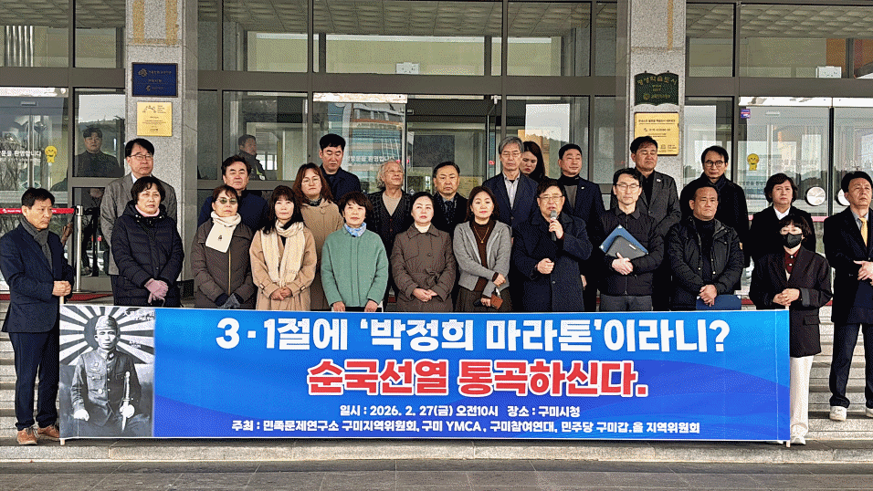 민족문제연구소 구미지역위원회, 구미 YMCA, 구미 참여연대, 더불어민주당 구미시 갑·을 지역위원회 등 구미 지역 시민사회단체와 정당이 3월1일 개최 예정인 ‘박정희 마라톤’ 행사를 강력히 규탄하며 즉각적인 취소를 촉구하고 나섰다.