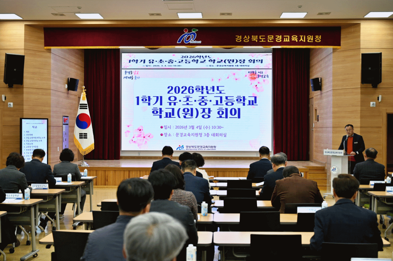 문경교육지원청(교육장 유진선)은 2026년 3월 4일(수) 문경교육지원청 3층 대회의실에서 관내 공·사립 유·초·중·고등학교 학교(원)장 및 교(원)감을 대상으로 2026학년도 1학기 학교 관리자 회의를 개최하였다.