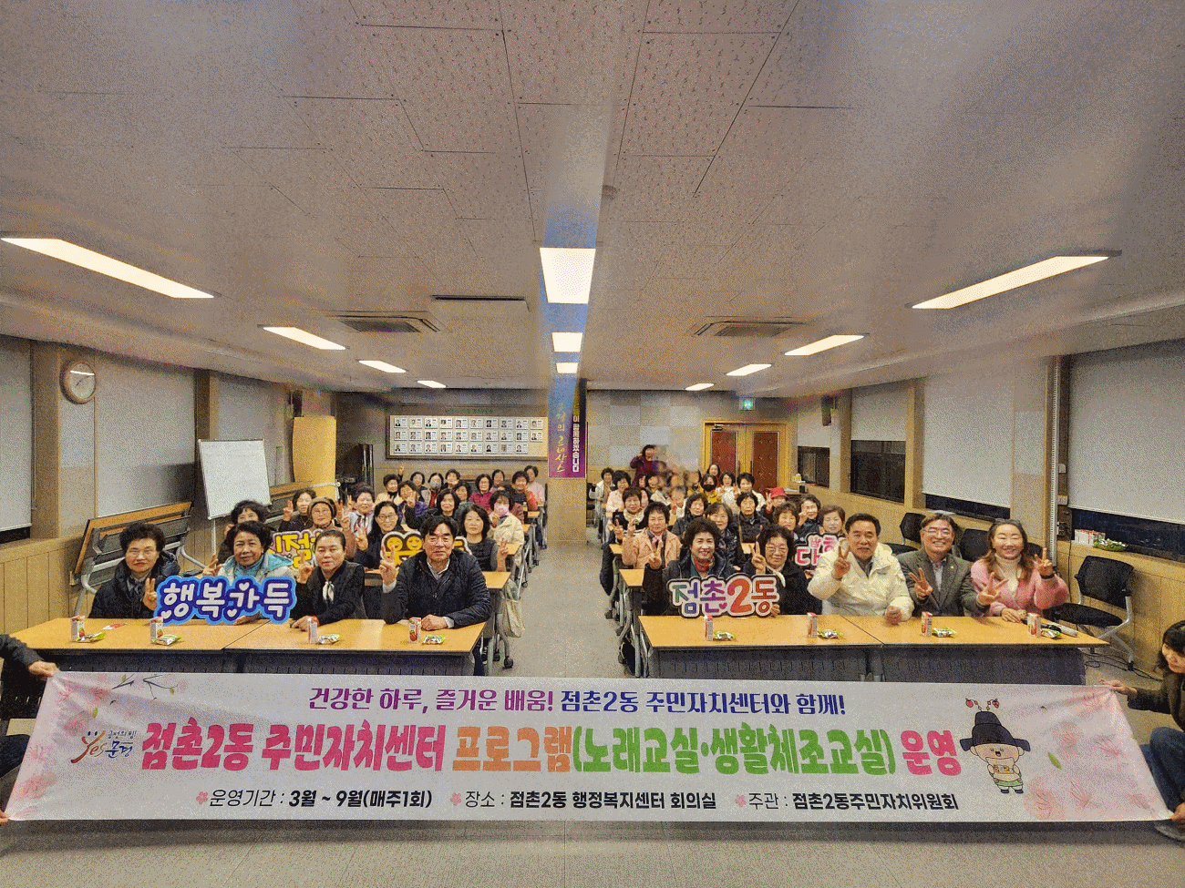 점촌2동 주민자치위원회(위원장 이종휘)는 3월 10일(화) 점촌2동 행정복지센터 회의실에서 주민자치프로그램 수강생 등 75여 명(노래교실 50명, 생활체조교실 25명)이 참여한 가운데 프로그램 개강식을 개최했다.