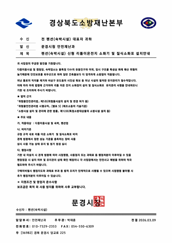 3월 13일 모 숙박업소에서 어설픈 공문이 핸드폰으로 도착 소화기를 구매 요청하다가 실패로 끝났다.