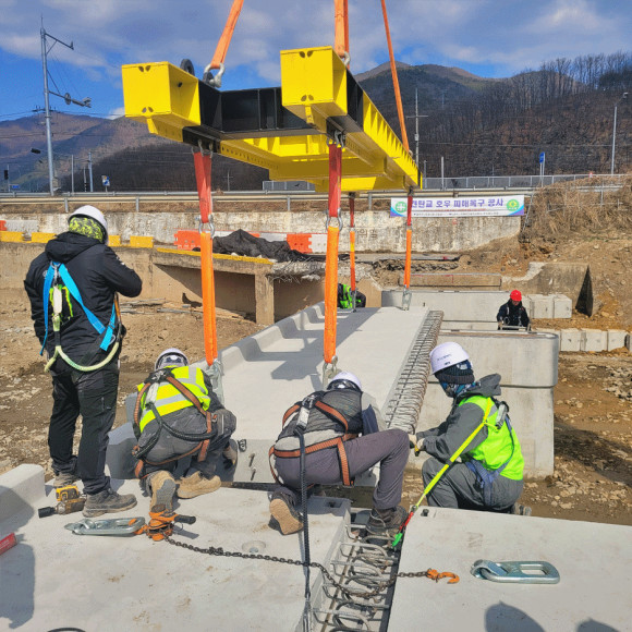 이번 현장견학은 집중호우로 피해를 입은 견탄교 복구공사 현장을 직접 방문하여 최신 교량 시공기술을 학습하고, 현장 중심의 실무 이해도를 높이기 위해 마련됐으며, 교량 상부 구조 시공에 적용되는 프리캐스트(Precast)공법을 중심으로 공장에서 제작된 교량 슬래브를 현장에서 거치하는 시공과정을 직접 확인하는 시간을 가졌다.