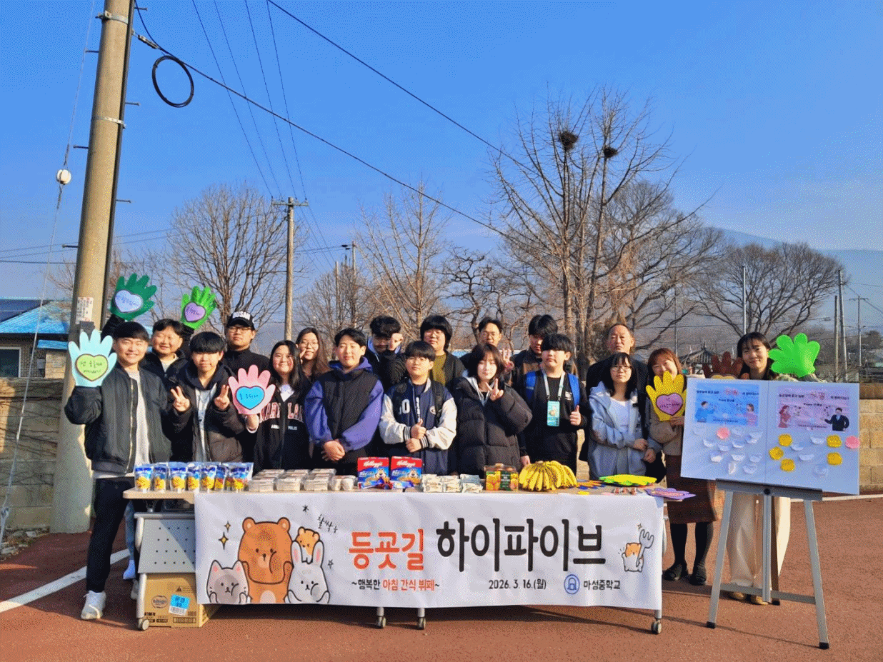 학생들의 학교생활 만족도와 소속감을 높여 학교폭력 예방에 앞장서고 있는 마성중학교(교장 홍성백)는 3월 16일(월) ‘어울림 교육의 날’을 맞이하여 ‘등굣길 하이파이브 데이 행사’를 성황리에 개최하였다.