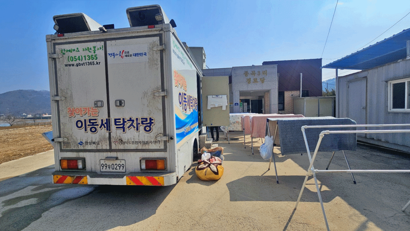 경상북도종합자원봉사센터에서 연중 운영하는“이동세탁 서비스”는 도내 마을을 대상으로 소외·취약계층의 삶의 질 향상을 위해 순회 방문하여 세탁차량을 이용하여 세탁서비스를 제공해주는 생활지원 서비스다.