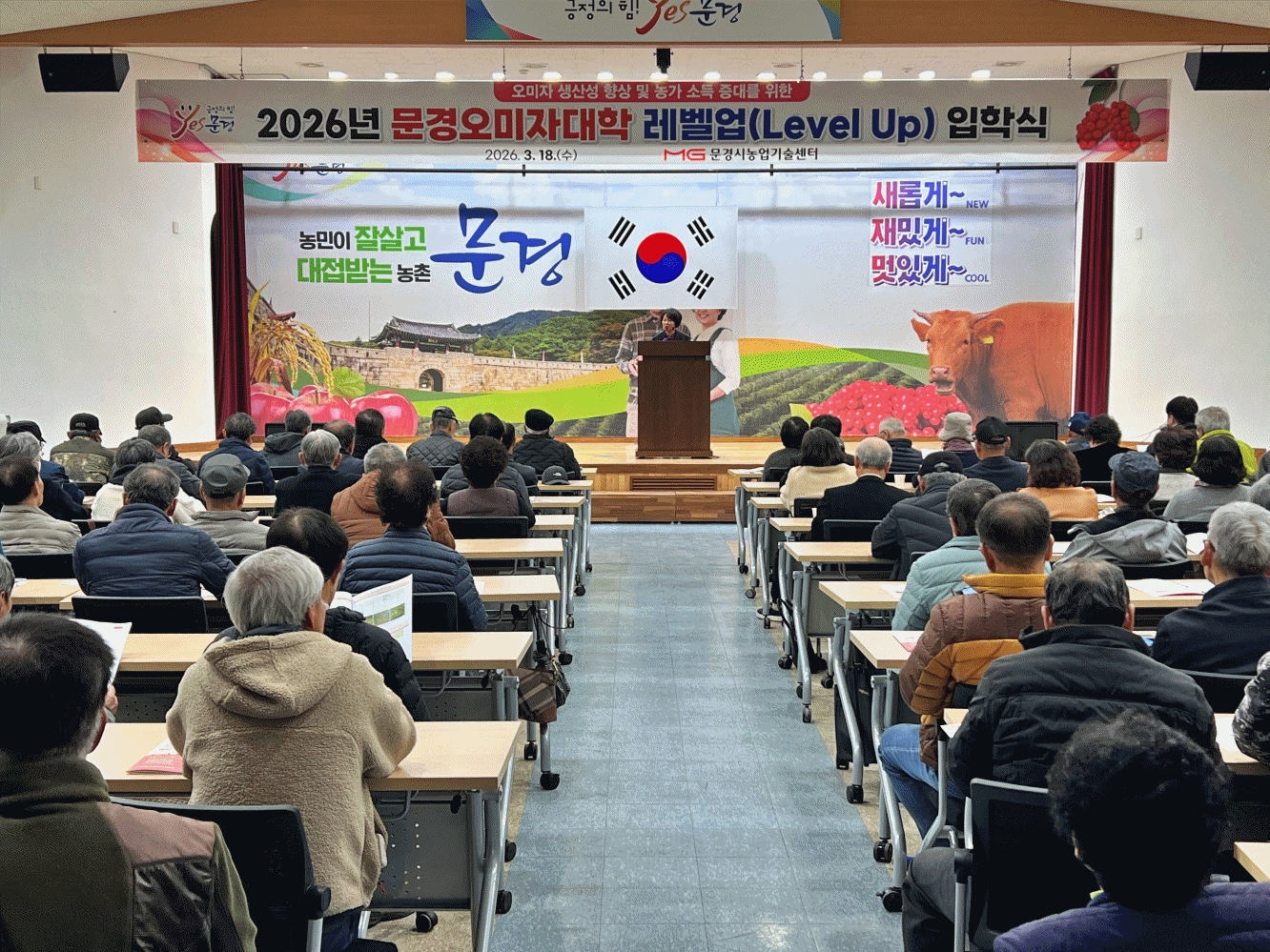 문경시농업기술센터(소장 김미자)는 18일 농업기술센터 4층 대강당에서‘2026년 문경오미자대학 레벨업(Level Up)’ 입학식을 개최하고 문경 오미자 산업 재도약을 위한 본격적인 교육과정 운영에 들어갔다.