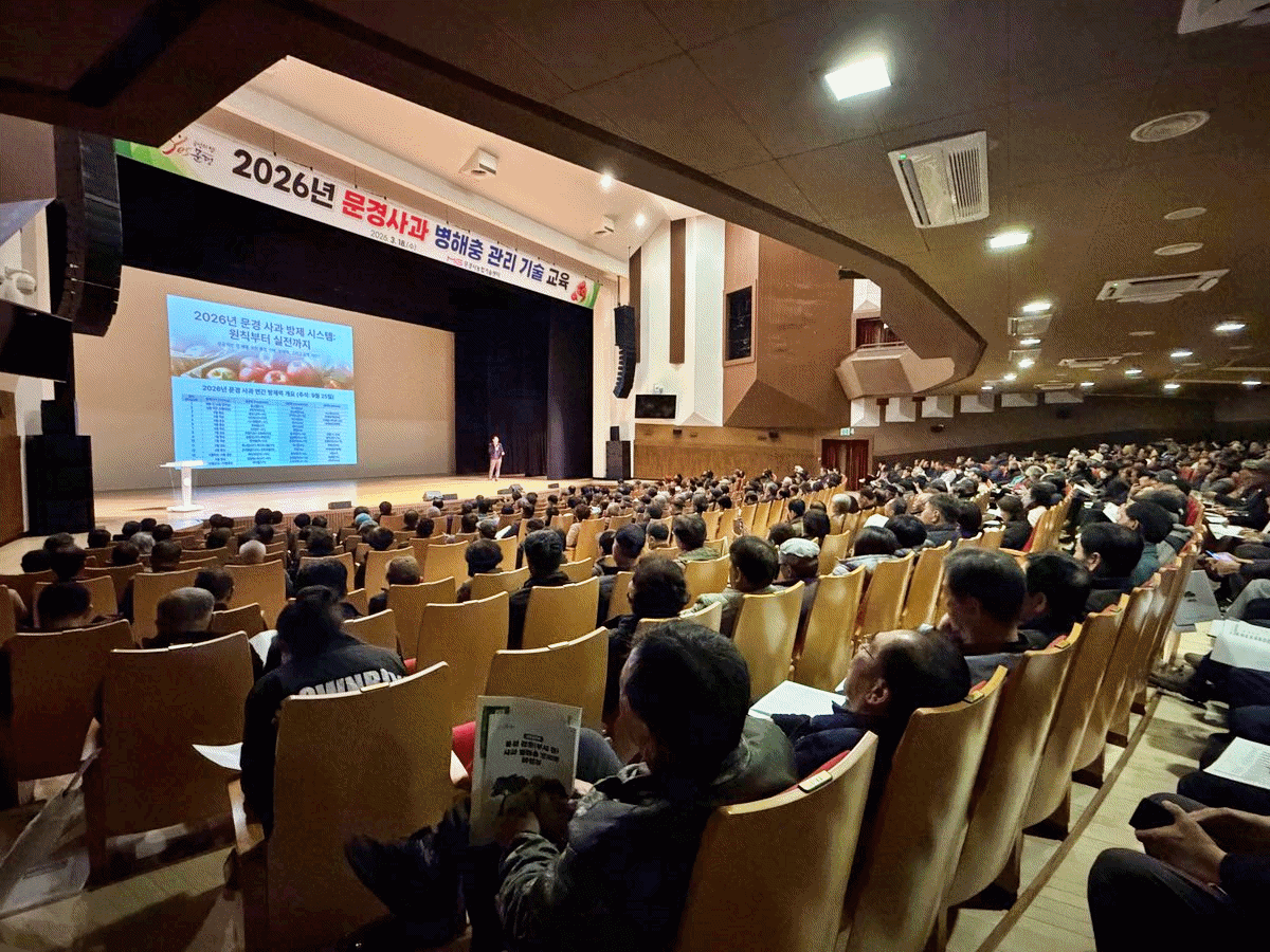 문경시농업기술센터(소장 김미자)는 3월 18일(수) 문화예술회관 대공연장에서 2026년 문경사과 병해충 관리 기술 교육을 추진했다.