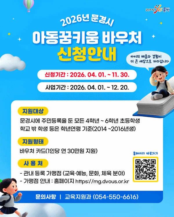 이번 사업은 문경시에 주민등록을 둔 초등학교 4학년부터 6학년까지 아동을 대상으로 하며, 약 1,200명이 혜택을 받을 예정이다. 1인당 연간 30만 원이 지원되는 맞춤형 복지 정책으로, 바우처는 전용 카드 형태로 지급되며 2026년 4월부터 12월 20일까지 사용할 수 있다.