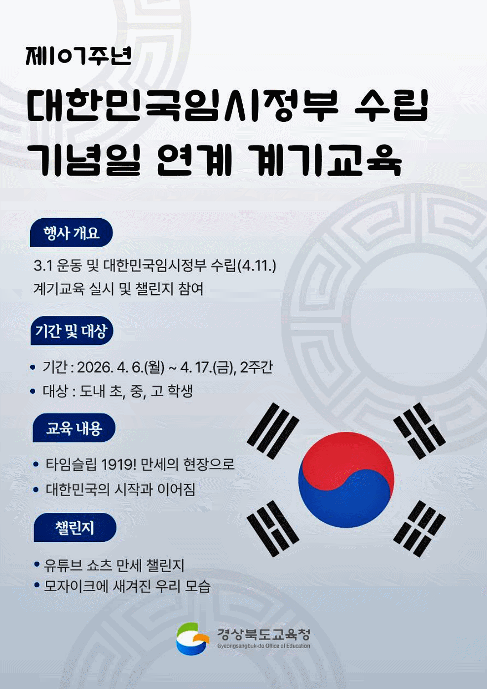 경북교육청(교육감 임종식)은 제107주년 대한민국임시정부 수립 기념일(4월 11일)을 맞아 6일부터 17일까지 2주간 도내 학생을 대상으로 계기 교육을 운영한다고 밝혔다.