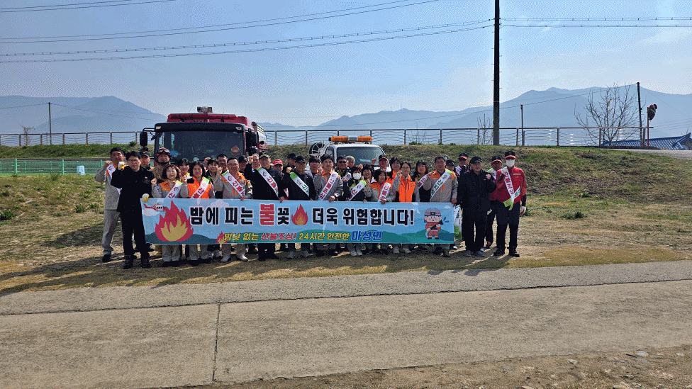 마성면은 산불로 인한 소중한 인명과 재산을 보호하기 위하여 ‘2026년 봄철 산불방지 종합대책’을 수립하고 그 계획에 따라 하천과 저수지 등 여덟곳의 헬기 취수장 정비를 완료했으며, 8명의 산불감시원 운영과 더불어 마을이장을 주축으로 한 자율감시단과 민간단체인 자율방제단을 운영하여 2중 3중으로 감시와 예방활동을 전개하는 한편 산불에 취약한 산림연접지 독립가옥과 시설물은 별도의 관리카드를 작성하여 주기적으로 방문하는 등 체계적인 산불예방 활동을 전개하고 있다.