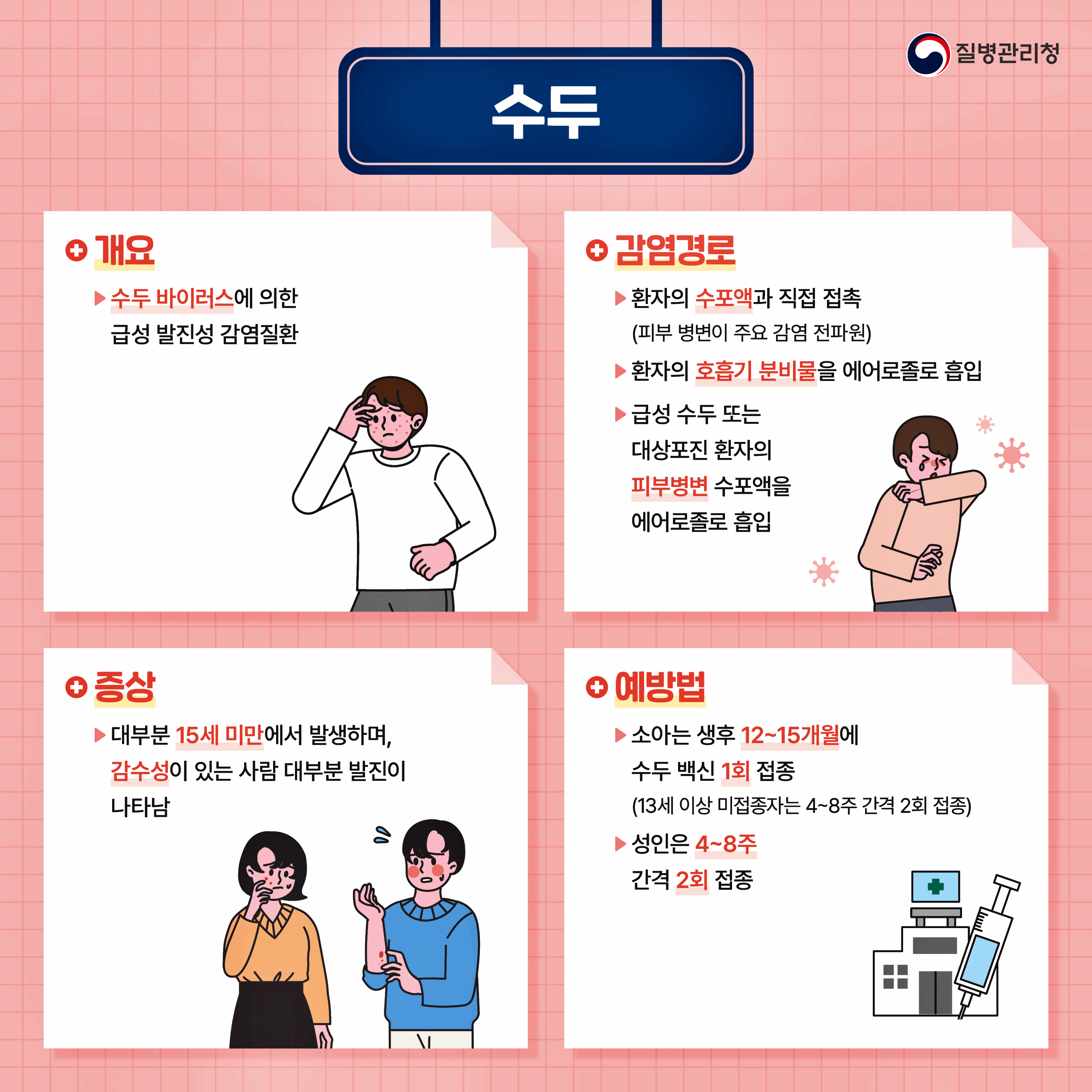 수두는 수두-대상포진 바이러스에 의해 발생하는 감염병으로 발열과 함께 온몸에 수포성 발진이 나타나는 것이 특징이며, 유행성 이하선염(볼거리)은 바이러스 감염으로 침샘이 붓고 통증을 동반하는 질환이다. 두 감염병 모두 기침이나 재채기를 통해 쉽게 전파되어 집단생활을 하는 어린이집, 유치원, 학교 등에서 빠르게 확산 될 수 있다.